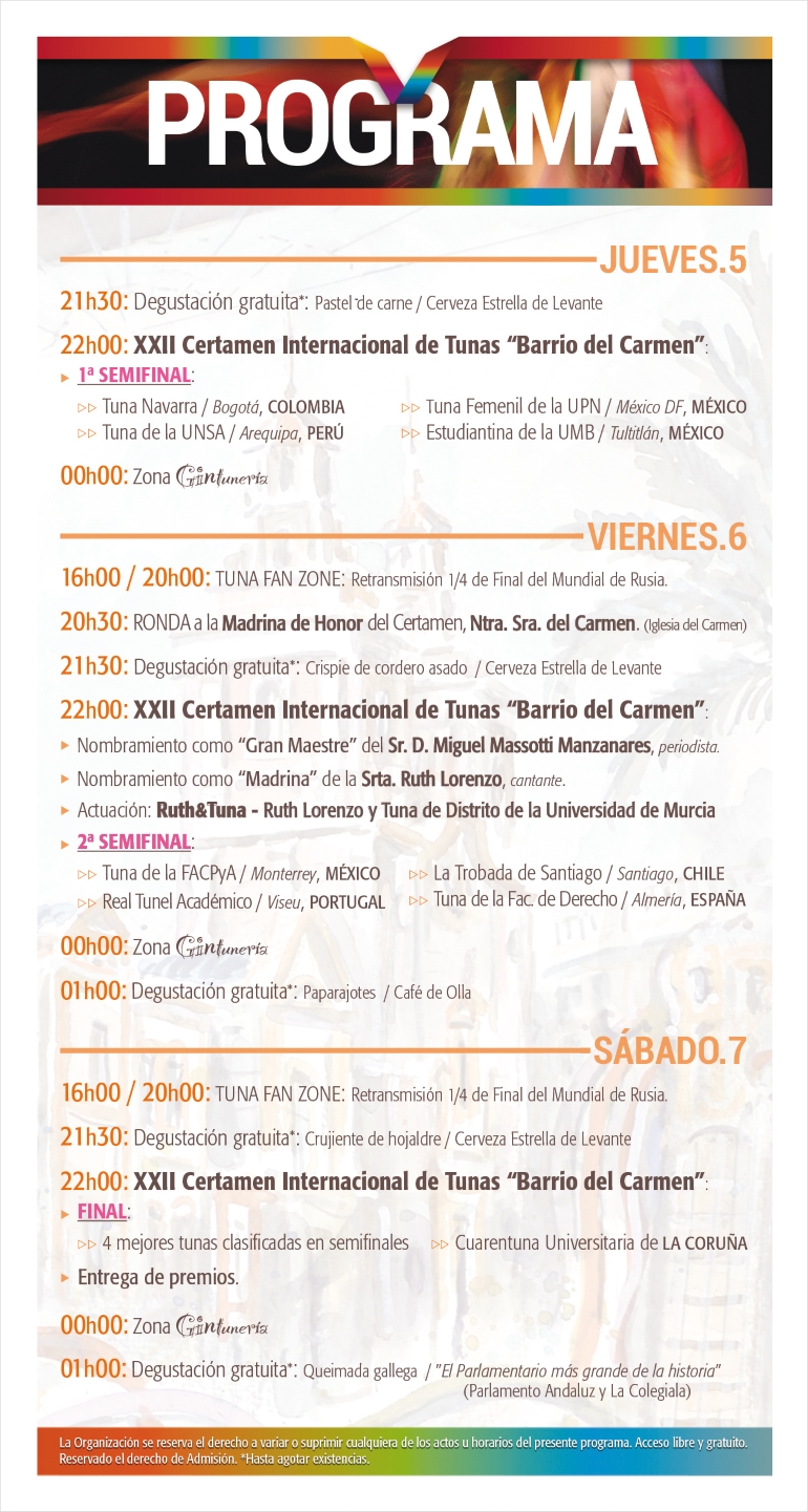 Sólo queda esperar que el espectáculo no haga sino desbordar, como ha sucedido año tras año, las previsiones que se hacen de él y que la próxima edición del Certamen Internacional de Tunas “Barrio del Carmen” vuelva a resultar un éxito.
