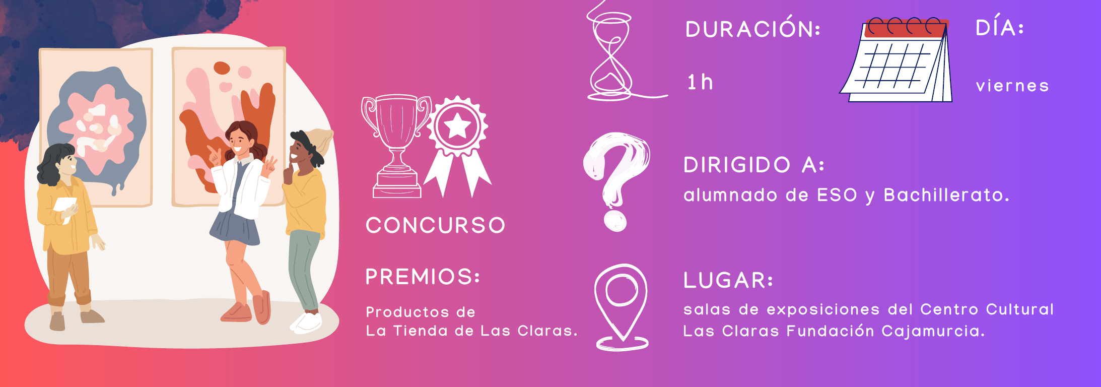 Dirigida a público adolescente, esta actividad combina una visita guiada dinámica por las exposiciones temporales que culmina con la propuesta de un concurso y premios. Una forma diferente de acercarse al arte: explorando, compartiendo y disfrutando juntos.